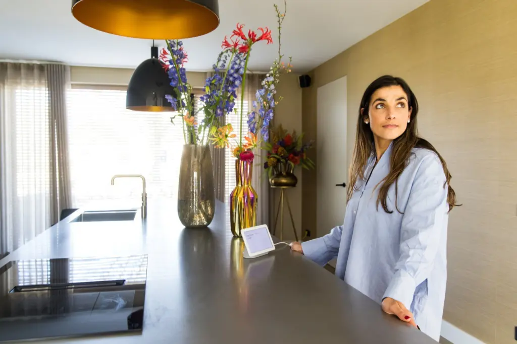 Vanuit onze eetkeuken kan ik met behulp van de slimme luidspreker de gordijnen in ons hele huis bedienen.